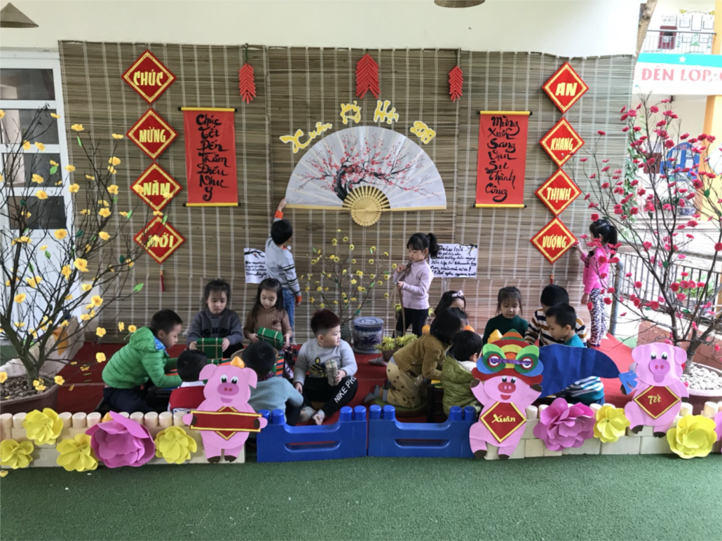 Thông qua buổi học, cô hướng cho bé biết được một số công việc của bố mẹ, mọi người khi chuẩn bị đón Tết, bé biết thể hiện tình cảm với người thân khi Tết đến, khách đến nhà chúc Tết, cách ứng xử khi đi chúc Tết cùng gia đình, bày tỏ sự biết ơn, cách giao tiếp ở chốn đông người, đọc những câu vè, lời thơ chúc Tết cho mọi người nghe, cách đáp lại tình cảm khi nhận được lời khen, lì xì từ người lớn. Từ đó, giáo dục bé biết một số phong tục khi Tết đến như: Chúc tết, trang trí, dọn dẹp nhà cửa…, tích cực tham gia vào hoạt động chuẩn bị đón tết tại trường và tại gia đình. Để buổi học thêm thú vị, cô tổ chức cho các bé tham gia trang trí thiệp chúc Tết, làm bao lì xì, trang trí cành đào, cành mai, sắp mâm ngũ quả…