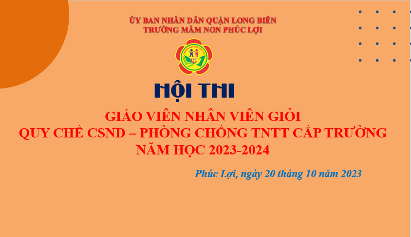 Vào hồi 17h ngày 20/10/2023 ,Trường mầm non Phúc Lợi tổ chức Lễ khai mạc hội thi “Giáo viên giỏi - Nhân viên nuôi dưỡng giỏi- Quy chế CSND trẻ- Phòng tránh tai nạn thương tích cấp trường năm học 2023-2024"
