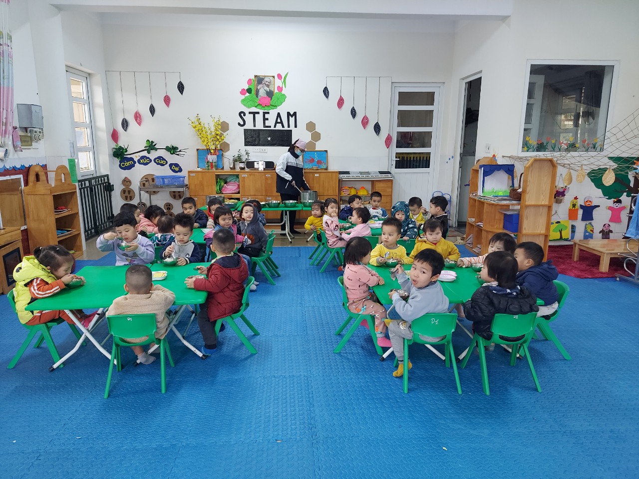 Trong giờ ăn thì cô giáo dục trẻ có một số thói quen vệ sinh như không nói chuyện khi ăn, nhai nhỏ nhẹ, không làm rơi vãi cơm ra bàn, không xúc cơm sang bát của bạn. Ăn xong trẻ còn biết tự cất bát và thìa vào đúng nơi quy định, trẻ được cô lau miệng, hướng dẫn đi uống nước và xúc miệng bằng nước muối.
