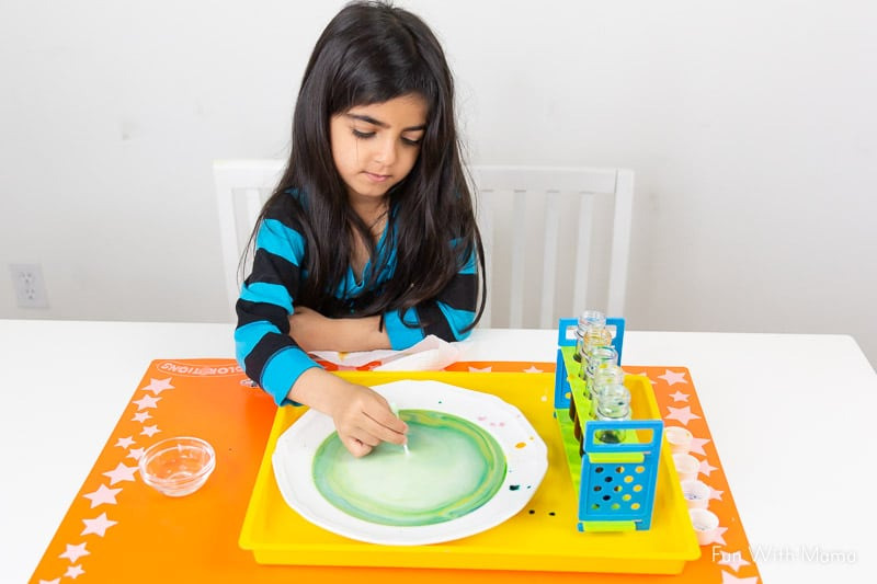 Giải thích: Do sữa được tạo thành bởi các khoáng chất, protein và chất béo nên khi xà phòng rửa chén thêm tiếp xúc sữa thì chất béo bắt đầu phân hủy. Có màu thực phẩm nên trẻ có thể dễ dàng nhìn thấy hiện tượng các phân tử xà phòng chạy xung quanh và cố gắng gắn vào các phân tử chất béo trong sữa.