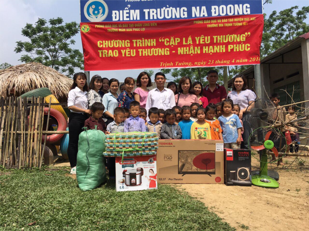 Căn cứ Kế hoạch số 89 /PGD&ĐT v/v Hướng dẫn thực hiện nhiệm vụ giáo dục Mầm non năm học 2017-2018 của Phòng GD&ĐT quận Long Biên ngày 31tháng 12 năm 2017.Căn cứ nhiệm vụ năm học 2017-2018 của trường MN Phúc Lợi. Căn cứ chương trình thi đua năm học 2017-2018 của Công đoàn trường Mầm non Phúc Lợi. Ngày 23/4/2018, Đại diện công đoàn nhà trường cùng với ông Nguyễn Văn Liệu - Trưởng ban phụ huynh nhà trường đã thực hiện chương trình “ Cặp lá yêu thương”, trao yêu thương- nhận hạnh phúc cho các em nhỏ tại trường mầm non Trịnh Tường số 1- Huyện Bát Xát- tỉnh Lào Cai.
